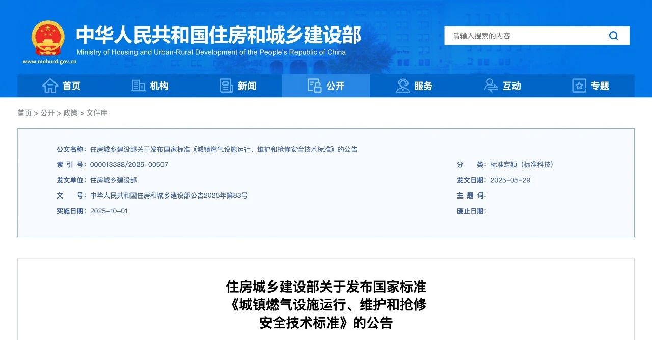 现批准《城镇燃气设施运行、维护和抢修安全技术标准》为国家标准,编号为GB/T51474-2025,自2025年10月1日起实施。原行业标准《城镇燃气设施运行、维护和抢修安全技术规程》(CJJ51-2016)同时废止。